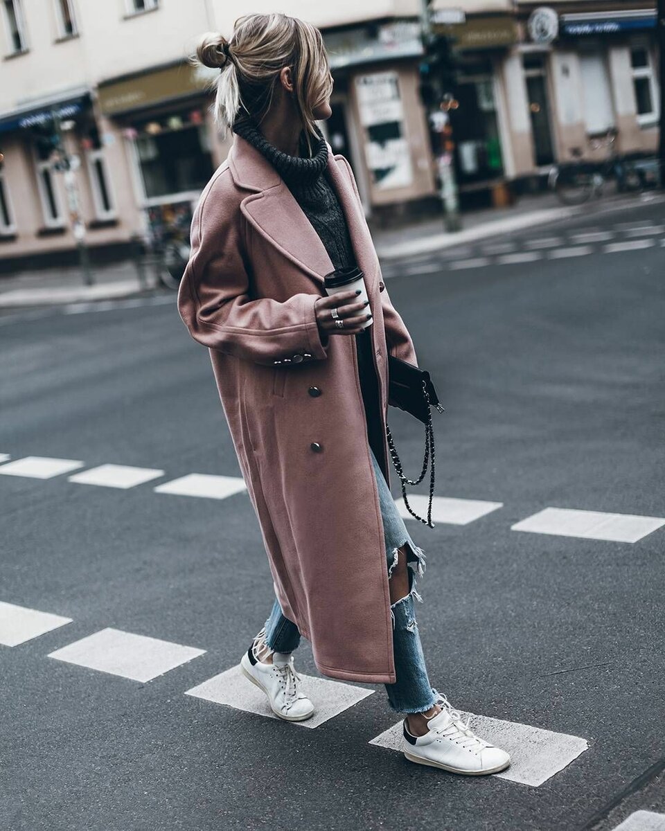 В моде удлиненные модели пальто. Такие фасоны идеально подходят для холодной погоды. А в сочетании с кроссами образ выглядит молодо и стильно.