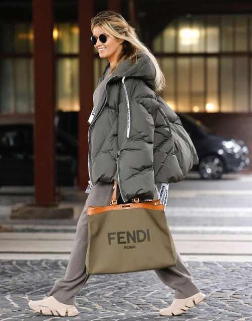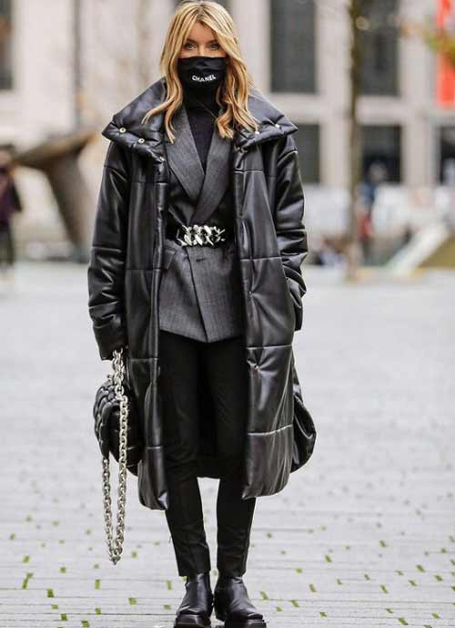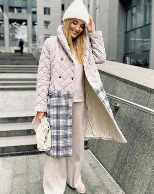 - Помимо перечисленного, модно смотрится тотал-Look стеганый пуховик с дутыми кюлотами/юбками/платьями и платками. Если не любите ощущение многослойности — используйте такие комплекты. Даже без ярких акцентов такие образы выглядят эффектно.