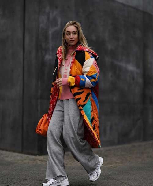 - Как например, в меру расслабленный образ — классический худи, широкие брюки/джинсы и укороченная куртка с объемным воротником.