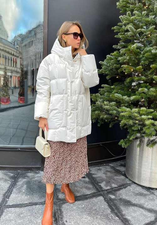 - Не останется незамеченным сет, где сочетаются легкое романтичное платье миди, свитер, теплый белый пуховик до середины бедра и высокие сапоги. В тренде по-прежнему разнофактурная многослойность.