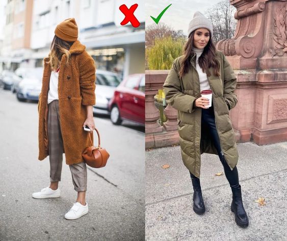 Согласитесь, что образ с левой стороны на фото смотрится менее гармонично. Оверсайзный или многослойный верх гораздно лучше смотрится с массивной обувью. Так образ будет выглядеть более гармонично.