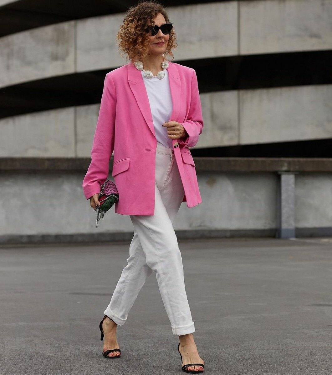 Очень хорошо, что этот цвет воплощён не в приторном платьице, а в строгом по крою блейзере. Ну и футболка с белыми джинсами тут кстати.