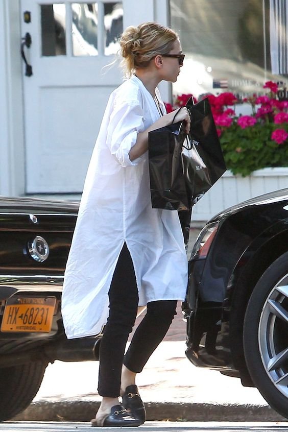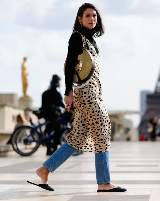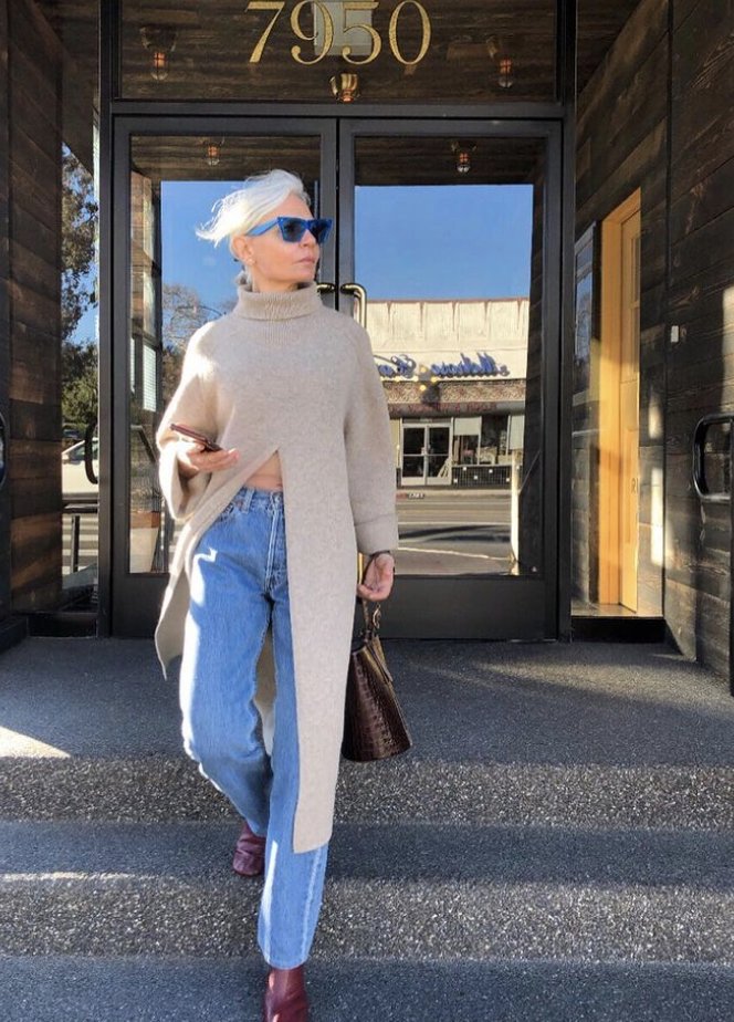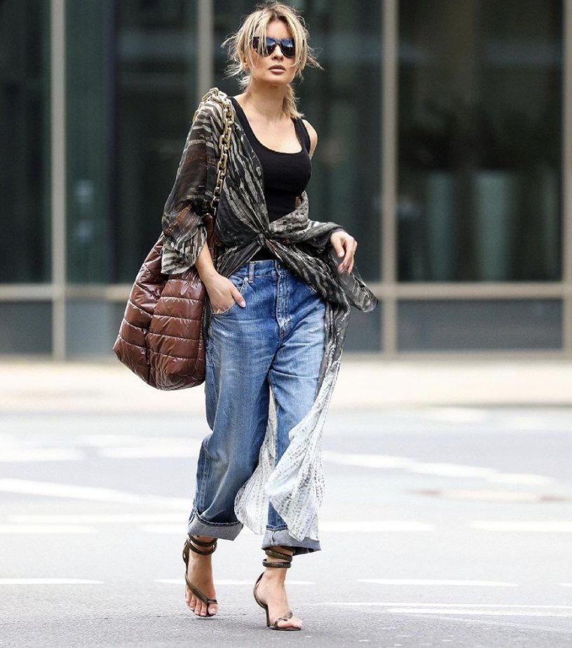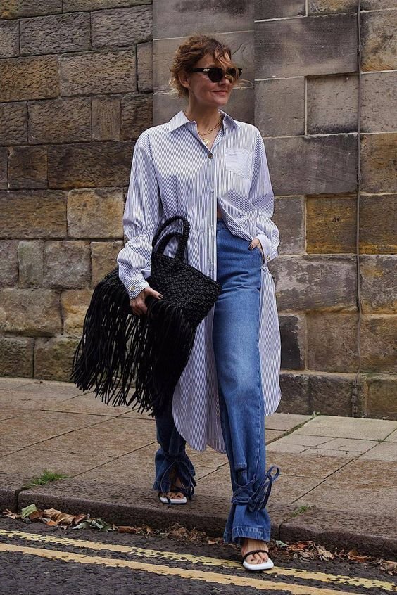 Попробуйте надеть джинсы с длинной туникой или платьем-рубашкой, распахнутой от талии. Единственный момент: проследите, чтобы верх был актуальным. Если неправильно выбрать тунику, образ может получиться с налетом прошлых лет. Лучше, если туника будет асимметричного кроя.