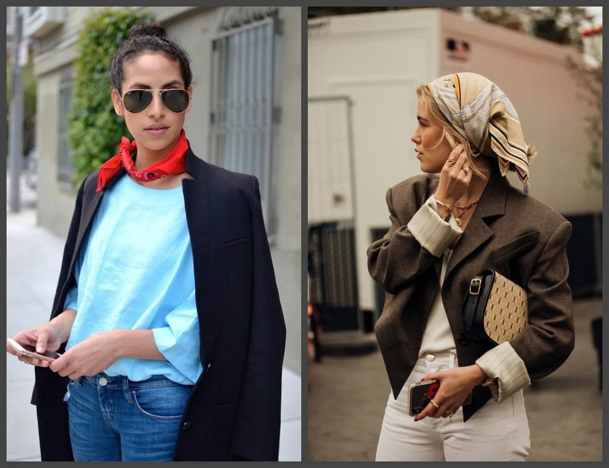 В этом варианте нам нужна косынка и расслабленный кэжуальный образ на прямых линиях. Такой платок привнесет в наряд немного самоиронии и хулиганства и с подчеркнуто женственным или деловым костюмом будет диссонировать. А вот джинсы, кроссовки, объемный свитер и ветровка/бомбер это то что нужно.