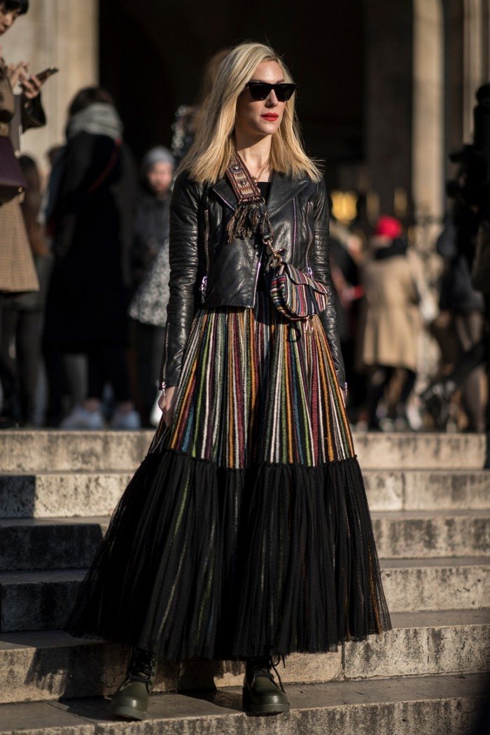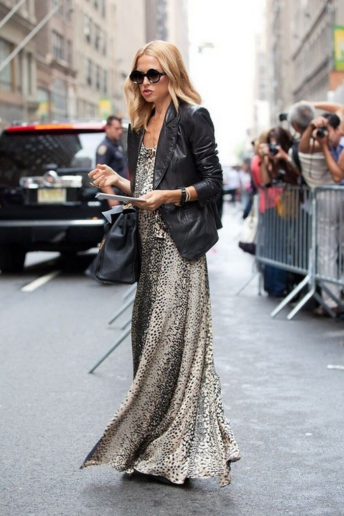 Легкий шелк или шифон смягчает брутальность косухи, и образ выглядит органичным.
