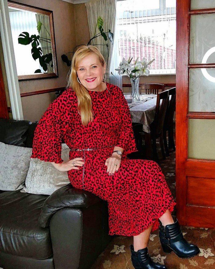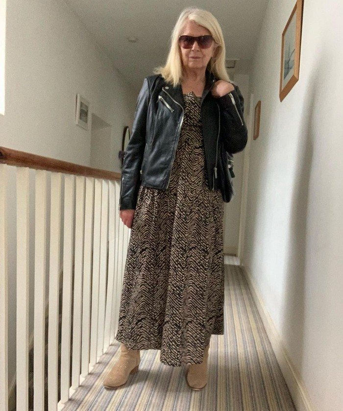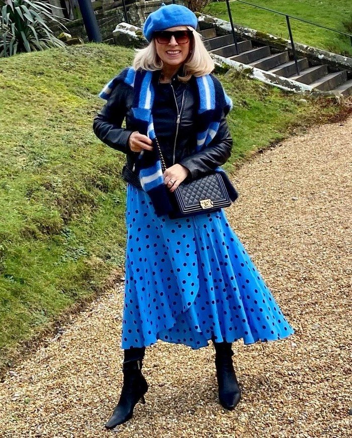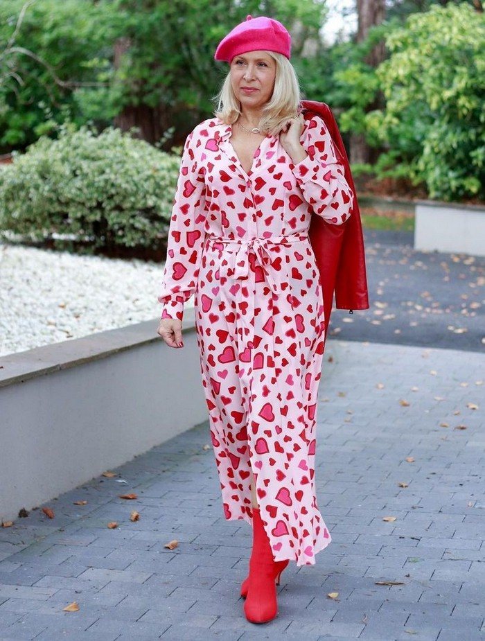 Этот комплект яркий, стильный и удобный. И только седина на волосах выдает в модели возраст, а образ, наоборот, молодит.