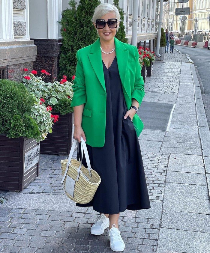 Платье А-кроя с изумрудным жакетом отлично подойдет для ранней осени. А белые кеды и соломенная сумочка делают образ легким и непринужденным.