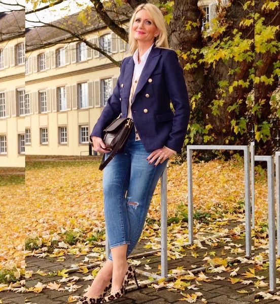 Джинсы привычного синего цвета без лишнего декора одинаково хорошо идут как юным девушкам, так и зрелым дамам. Дополните джинсы удлиненным жакетом и стильный образ на осень готов!