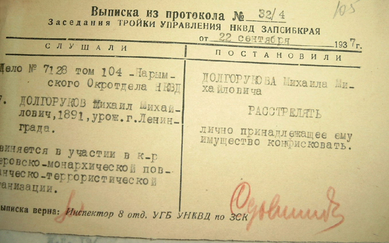 Машина Большого Террора в 1930-е сметала всех на своем пути. Особенно рьяно НКВД старался уничтожить тех людей, кто имел какое-либо отношение к высшему сословию. Князь Михаил Долгоруков пережил три ареста, больше 10 лет провел в лагерях, но в итоге его расстреляли - непонятно за что…