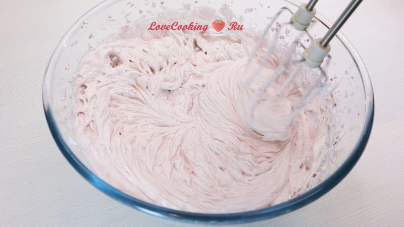 Добавляем малиновую заварную основу и растопленный желатин. Перемешиваем миксером до однородности.