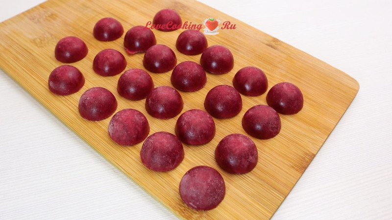 Выкладываем вторую часть мусса. Распределяем по нему малиновые полусферы, которые накрываем следующей частью мусса. Если мусс сильно застыл, то подогрейте его несколько секунд в микроволновке и тщательно перемешайте. Так он ровнее распределится.