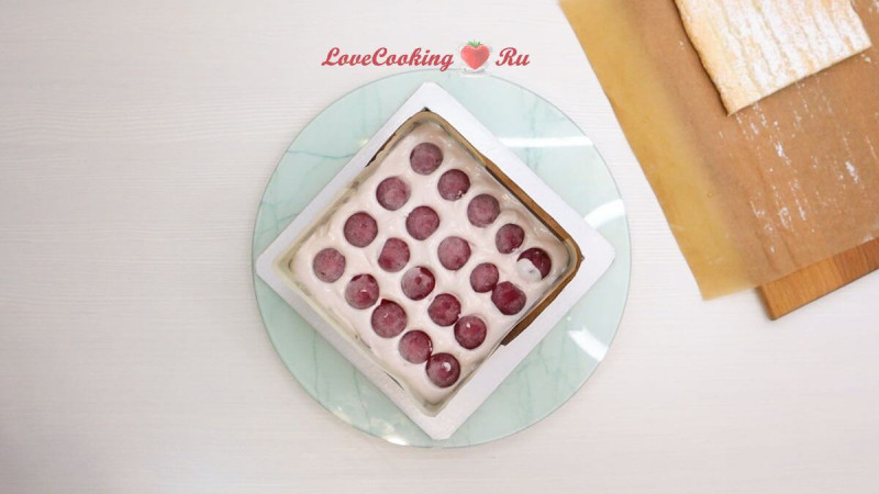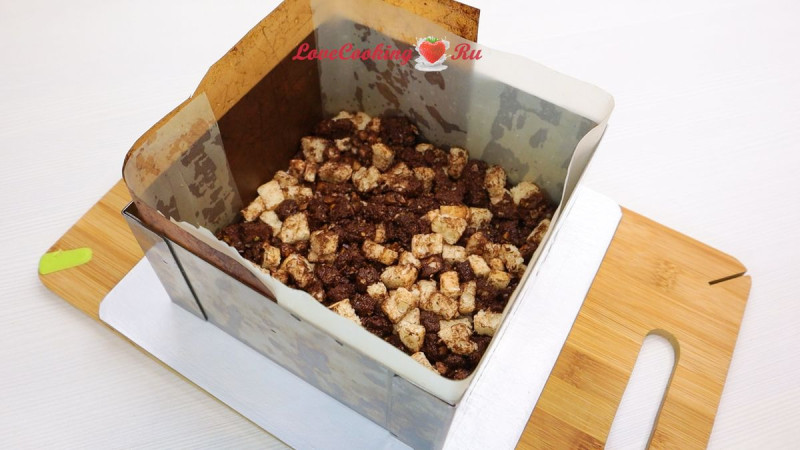 Распределяем основу по дну формы 16х16 см, стенки которой застелены тефлоновым ковриком.