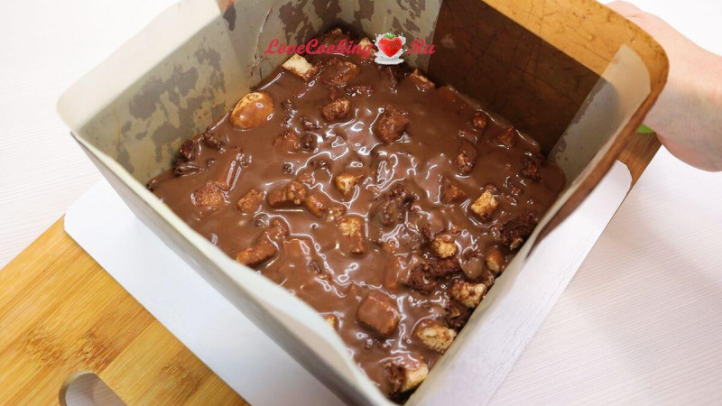 Соединяем измельчённые орехи, нарезанные коржи Савоярди, растопленные шоколад и масло. Хорошо перемешиваем.