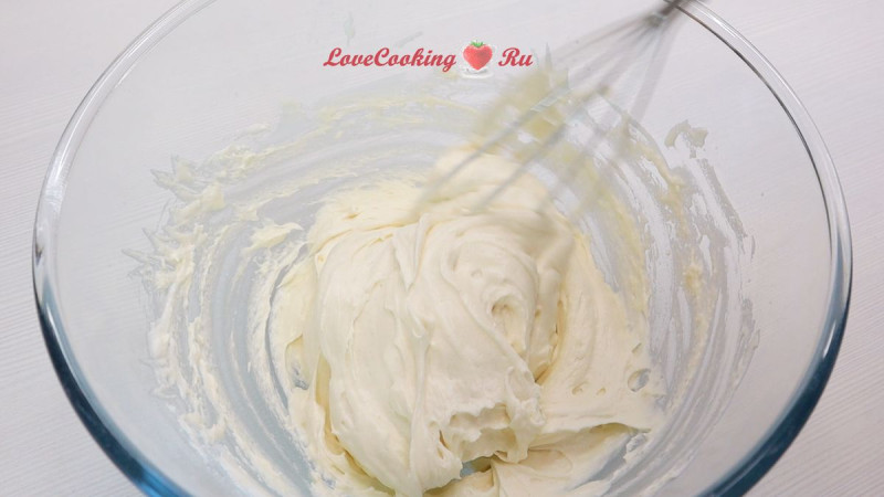Соединяем маскарпоне, холодные сливки и сахар. Взбиваем до мягких пиков.