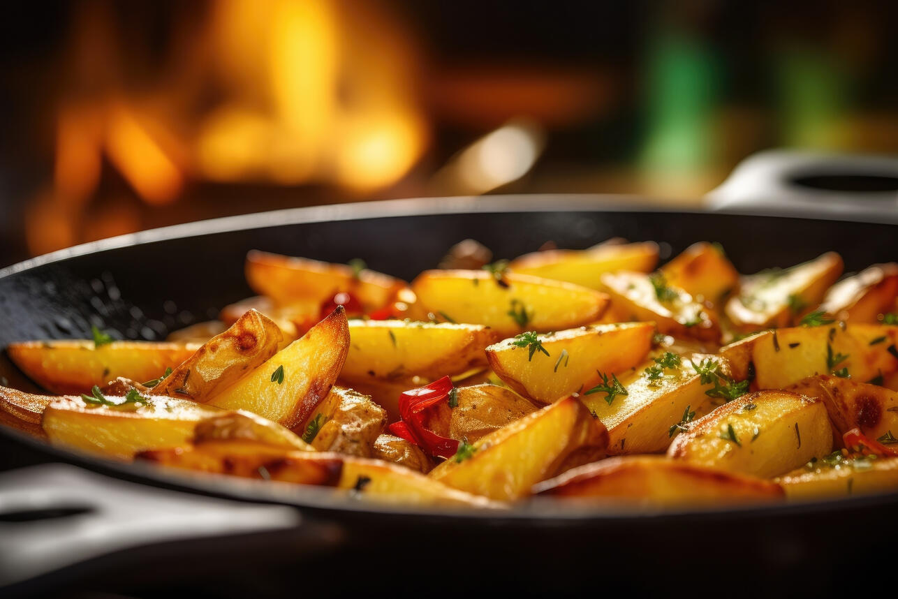 Сковородка — это главный союзник в жарке картошки. Неправильно подобранная посуда может привести к тому, что картошка прилипнет или же во время жарки просто вывалится из сковороды. Оптимальным выбором будет массивная сковорода с толстым дном и высокими стенками, которая обеспечивает равномерное нагревание и удерживает кусочки картофеля на месте.