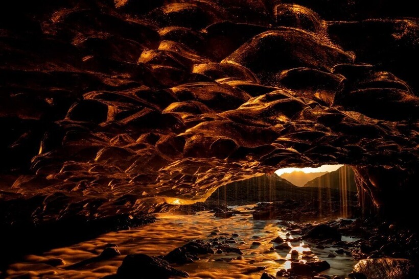 Тонкий лед на дне ледниковой пещеры отражает солнечные лучи