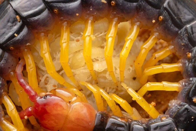 Самка сороконожки защищает своих новорожденных детенышей от хищников