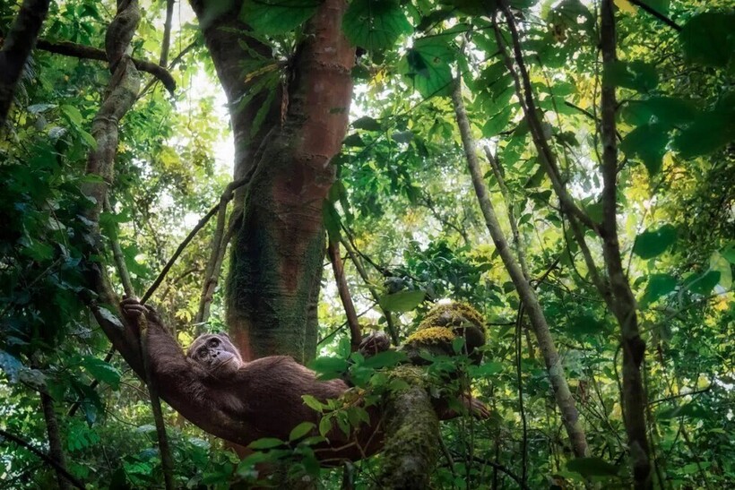 Шимпанзе отдыхает на дереве, словно в гамаке, в национальном парке Уганды