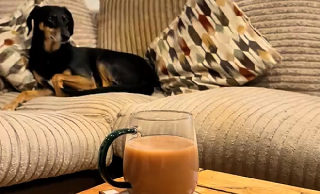 Собака спрыгнула с дивана, метнулась к журнальному столику и уверенно потянулась мордой к кружке. На видео заметно, как собака делает несколько быстрых глотков, затем замирает и внимательно смотрит в сторону двери, будто прислушивается, не возвращается ли хозяйка.