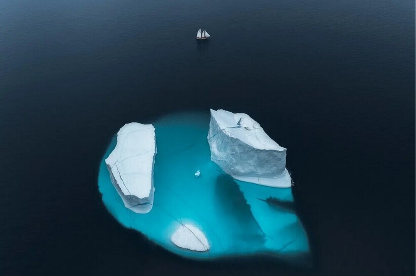 Небольшой парусник проплывает мимо двух массивных айсбергов в арктических водах Гренландии