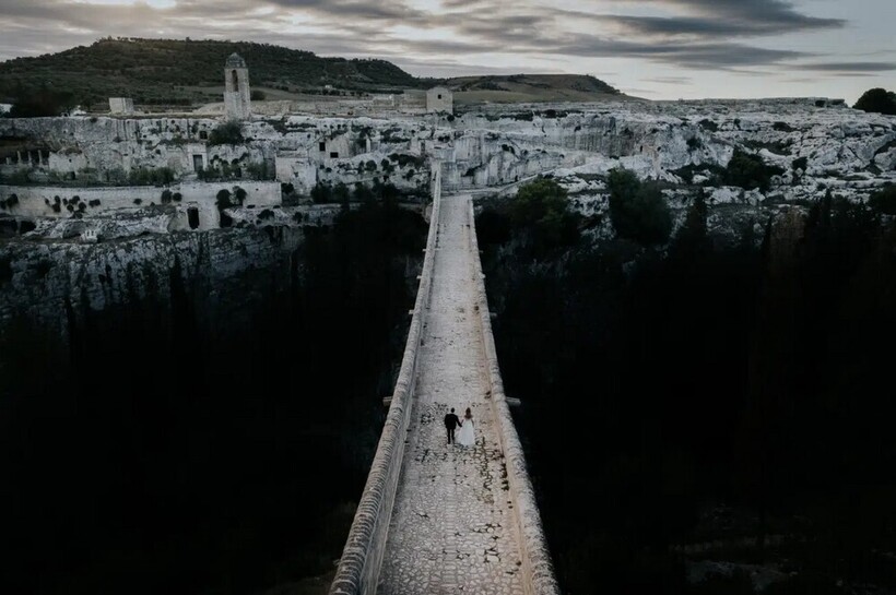 Пара на мосту через ущелье в старинном итальянском городе